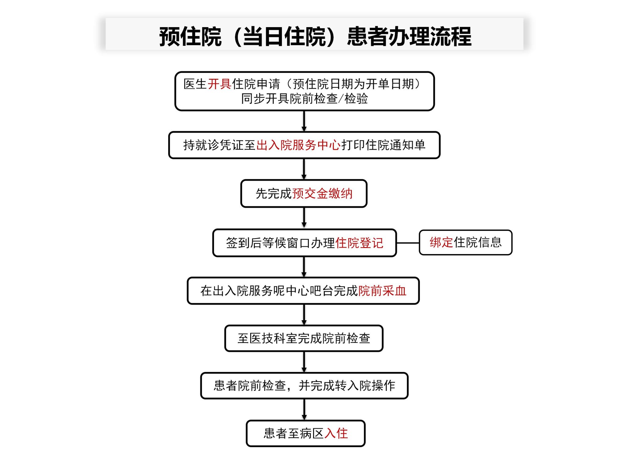 当日住院患者在办理窗口完成身高体重血压的测量、复印身份证件、佩戴住院腕带,完成相关住院前准备手续后至指定病区入住。