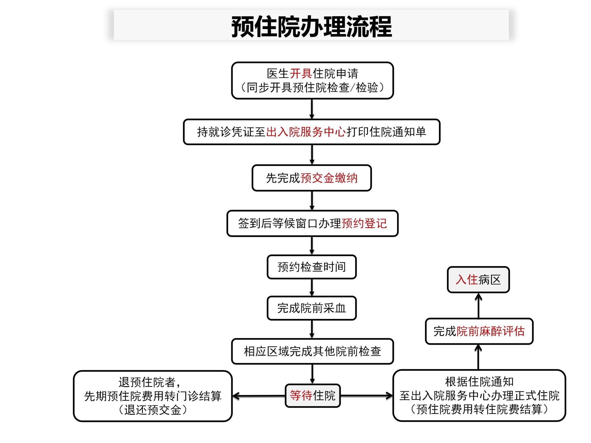 4.预住院手术患者,完成转入院手续后至麻醉评估中心先完成术前麻醉评估后再至指定病区入住。