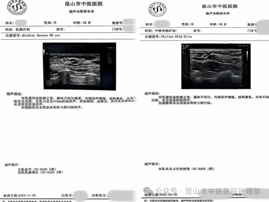 38岁王女士(化名)多年来经期乳房胀痛,检查发现乳腺结节,BI-RADS分类为3级。王女士在昆山市中医医院接受中医传统特色疗法3个月后,不仅胀痛完全消失,复查显示结节也已“消失”,这显著的转变,究竟是何种中医传统疗法的功劳?