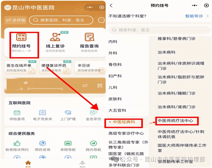 中医传统疗法中心线上预约流程:昆山市中医医院公众号-预约挂号-中医经典科-中医传统疗法中心。预约电话:0512-57055273地点:昆山市中医医院南门向西50米