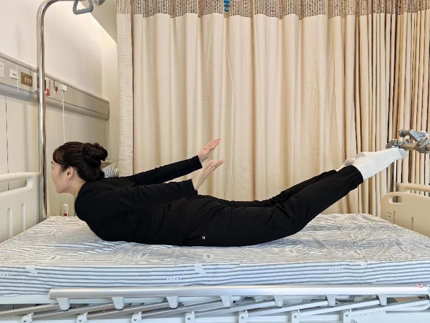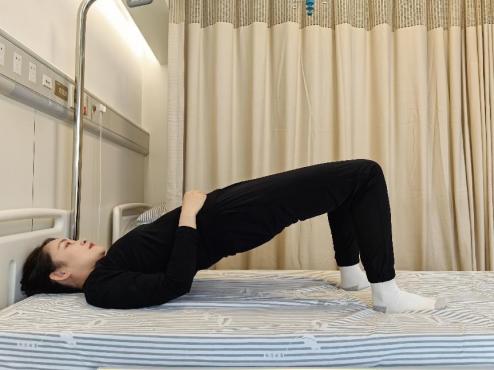 仰卧,去枕屈膝,双肘尖贴床,肘关节屈曲60度将腰背臀抬起,持续3-5秒。