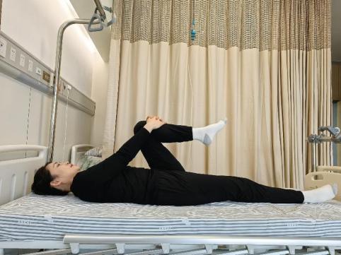 仰卧,双手抱单膝、屈髋,尽量让膝关节向胸前靠拢,以感觉有坐骨神经牵拉为宜。
