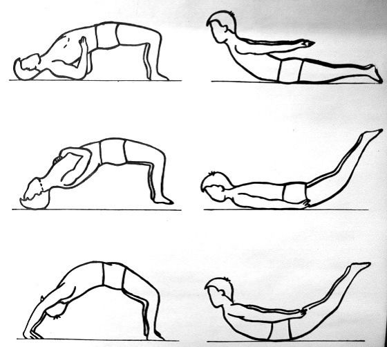 1.飞燕式锻炼:患者俯卧位,双下肢伸直,两手贴在身体两旁,下半身不动,抬头时上半身向后背伸,每日3组,每组做10次。逐渐增加为抬头上半身后伸与双下肢直腿后伸同时进行。腰部尽量背伸形似飞燕,每日5~10组,每组20次。