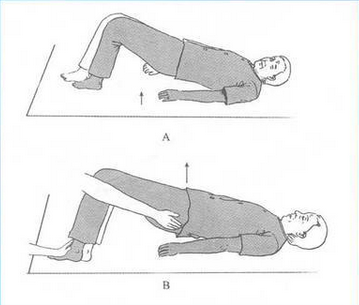 桥式运动:仰卧位,屈曲膝关节,足支撑在床上。将臀部从床上抬起,并保持骨盆呈水平位;训练者一只手向下压住患者的膝部,另一只手轻拍患者的臀部,帮助其抬臀、伸髋。