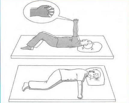 1.向患侧翻身训练:脑卒中患者仰卧,双手叉握,患手拇指压在健侧拇指上。