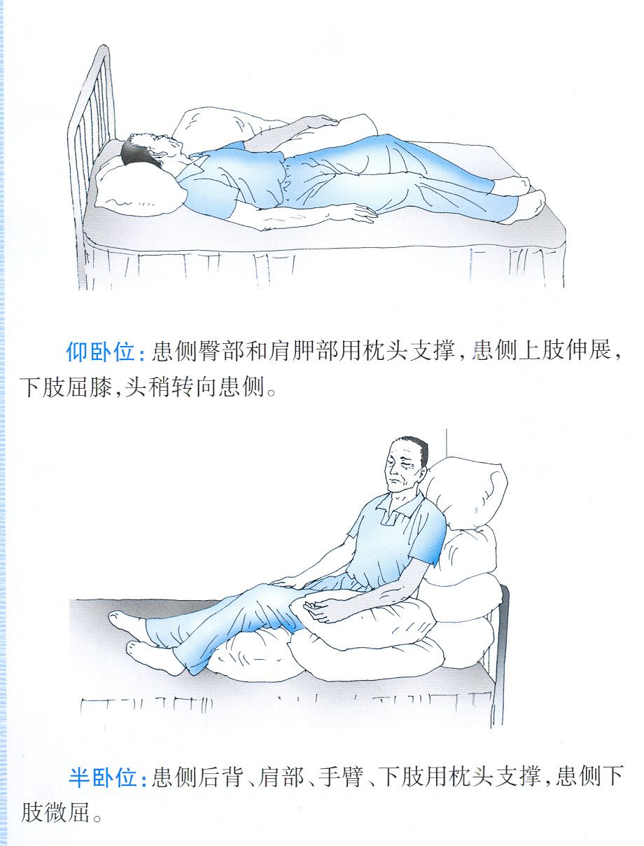 3.向健侧翻身训练:第一步同上,双上肢伸直,指向天花板,用健侧脚钩住患侧小腿;双上肢向健侧摆动,同时伸健侧下肢,借助于惯性带动身体翻向健侧。