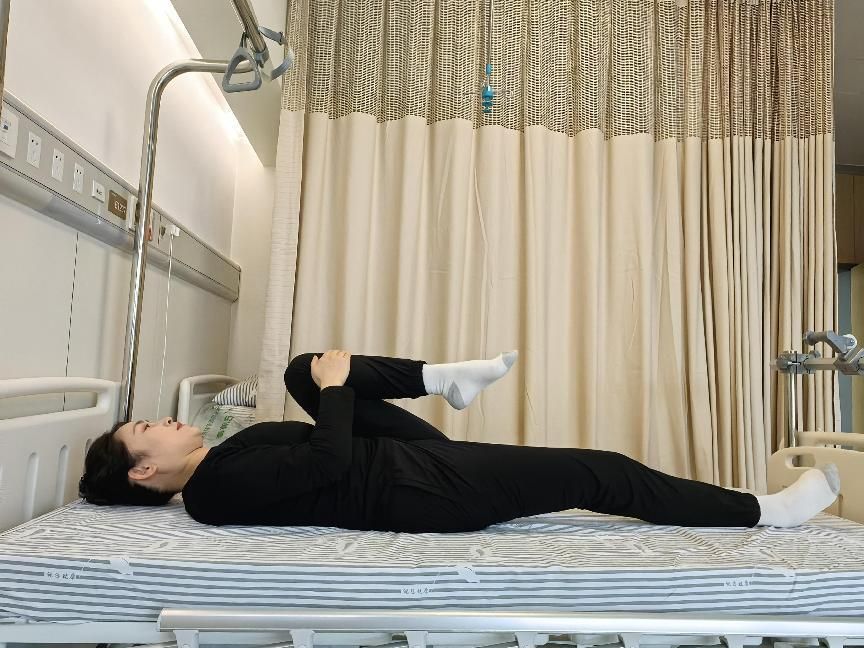 仰卧,双手抱单膝、屈髋,尽量让膝关节向胸前靠拢,以感觉有坐骨神经牵拉为宜。