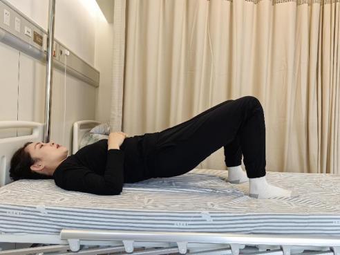 仰卧,去枕屈膝,双肘尖贴床,肘关节屈曲60度将腰背臀抬起,持续3-5秒。
