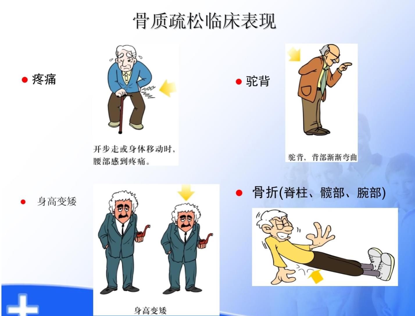 4.请坚持抗骨质疏松治疗,避免久坐久站及负重运动,避免跌倒及弯腰拾物等。