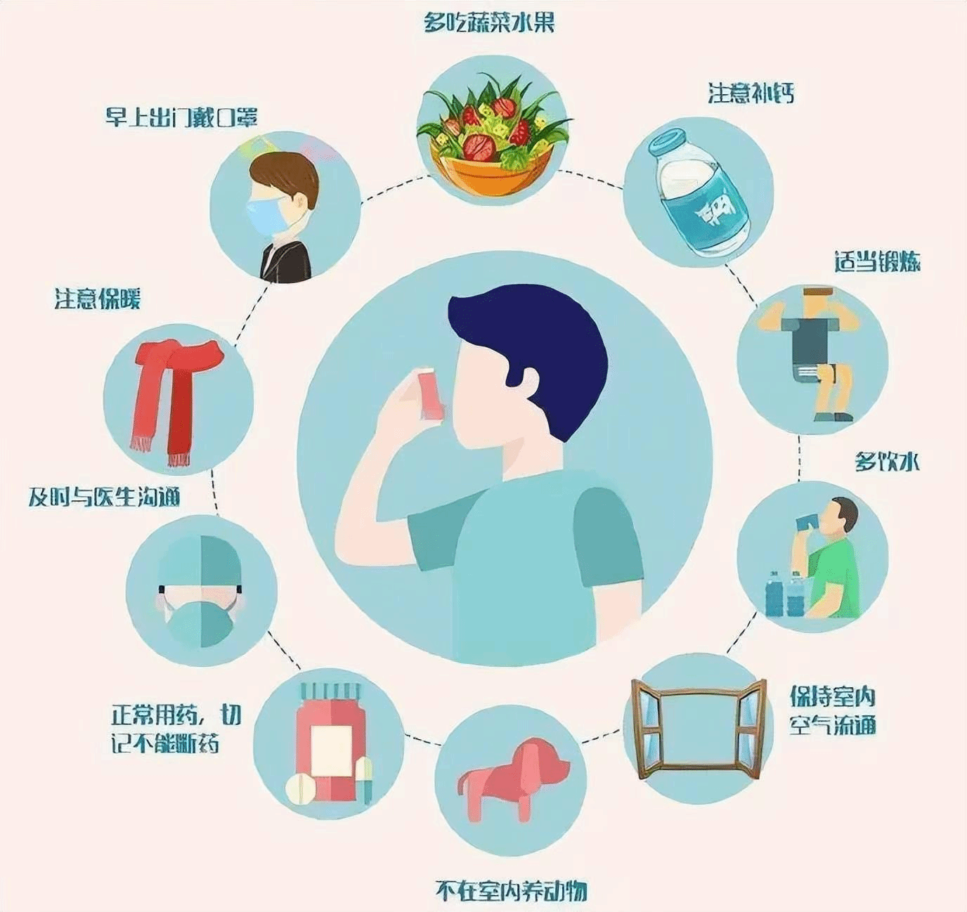 1.平时慎起居、避风寒、防感冒,居室内禁放花、草、地毯等。注意保暖,坚持适度体育锻炼,增强抗病能力。流感流行时,少去公共场所活动。