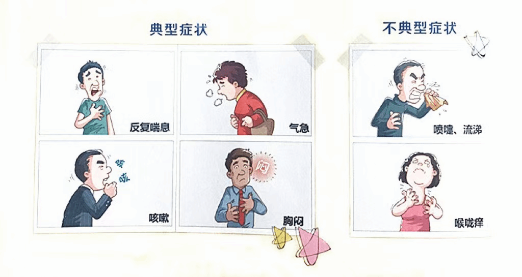 临床表现为反复发作的喘息、气急、胸闷或咳嗽等症状,多于夜间及凌晨发作或加重,多数病人可自行或治疗后缓解。