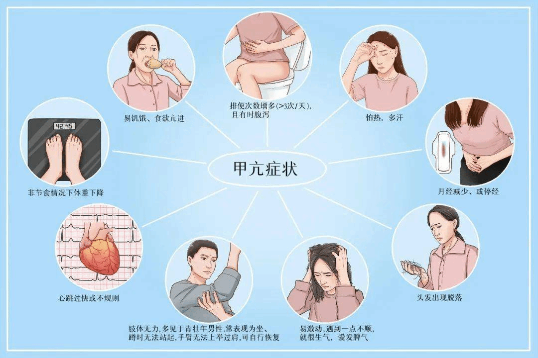 1.善食易饥,消瘦,怕热多汗,多言好动,情绪不稳定,胸闷,心率失常等。