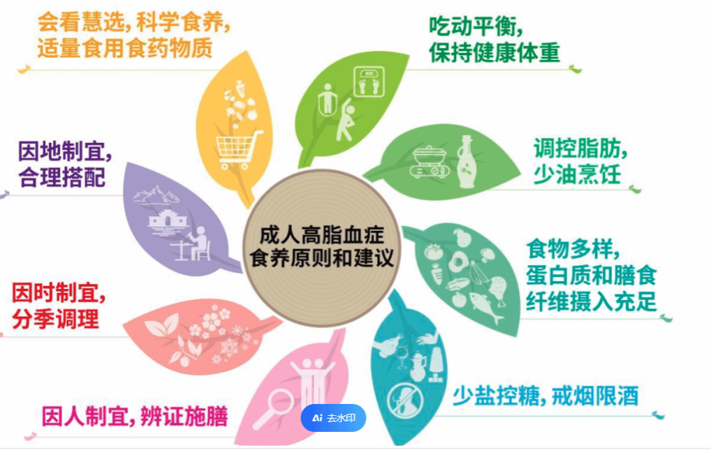 1.根据病情、性别、年龄、体重、劳动强度、文化背景、饮食习惯等制订个体化饮食计划。避免进食高脂、高胆固醇食物,如肥肉、禽肉皮、动物油脂、棕榈油、蛋黄、 动物内脏、鱼子、鱿鱼、墨鱼等。摄入低热量饮食,如淀粉、玉米、鱼类、豆类、奶类、蔬菜、瓜果等,可减少总热量摄入,减少胆固醇合成。摄入高纤维饮食,如粗粮、杂粮、干豆类、蔬菜、水果等,以增加食物纤维含量,满足饱腹感,有利于减少热能的摄入,并提高食物纤维与胆汁酸结合,增加胆盐在粪便中的排泄,降低血清胆固醇浓度。戒烟限酒,禁用烈性酒,以减少引起动脉粥样硬化的危险因素。