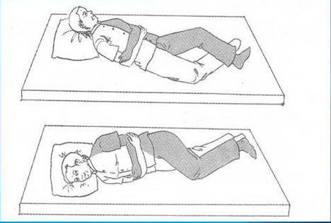 3.向健侧翻身训练:第一步同上,双上肢伸直,指向天花板,用健侧脚钩住患侧小腿;双上肢向健侧摆动,同时伸健侧下肢,借助于惯性带动身体翻向健侧。