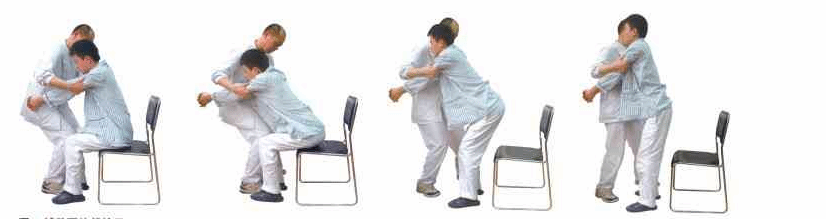 取坐位,双足平放地上,交叉握的双手放在前面的凳子上,凳子所放位置应使患者的手放在上面时两肘能伸直,头向前能超过足。治疗师站在患者患侧,一手将患侧膝部向前拉,另一手放在对侧髋部帮助患者抬起臀部,完成站立。