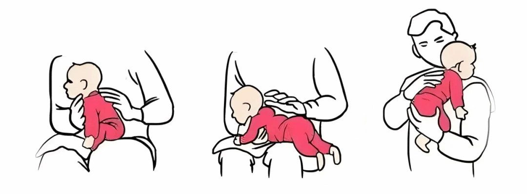 坐怀式:让宝宝坐在你的腿上,稍向前倾,一只手扶住宝宝的下巴并支撑胸部,另一只手轻拍或轻抚宝宝的背部。