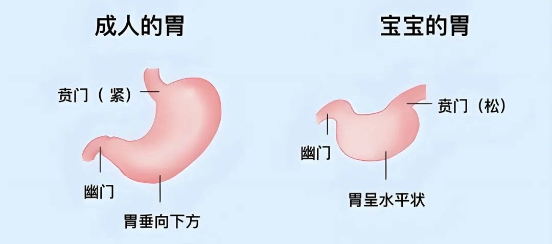新生儿的胃,呈水平位,同时贲门括约肌的收缩功能还未发育成熟,比较松弛;成人进食时,当食物进入胃部后,贲门会通过收缩来防止食物逆流回食道;新生儿如果吃得太饱或喝奶时吞入空气又没有排出来,就容易发生吐奶、溢奶。